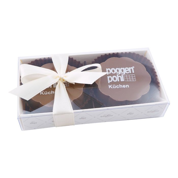 2er Grüessli Rosette Siebdruck - Grüessli aus bester Schweizer Milchschokolade. Der Siebdruck hat eine sehr feine Auflösung und ein sehr guter Kontrast. Für jede Farbe muss ein Sieb hergestellt werden. Der Geschmack der Schokolade wird durch den Siebdruck nicht beeinflusst. Der Siebdruck eignet sich für grössere Auflagen ab 50 Stück. Die einmaligen Druckkosten sind teurer als beim Fotodruck und varieren preislich je nach Anzahl Farben.