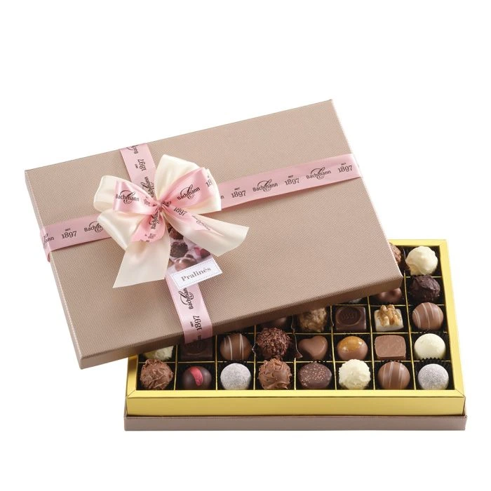 40er Bonbonnière - Eine exquisite Auswahl von 40 handgefertigten Pralinés aus feinster Schweizer Schokolade. Die harmonische Mischung kombiniert cremige, nussige und fruchtige Sorten mit feinen Likörnoten.