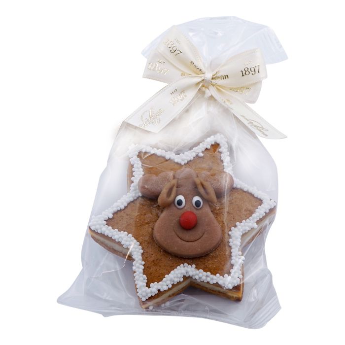 Biber Stern Elch – Saftiger Lebkuchen mit zarter Mandelmasse, verfeinert mit Honig und edlen Gewürzen. Liebevoll gefertigt und festlich dekoriert – ein klassisches Weihnachtsgebäck, ideal als kleine Aufmerksamkeit oder feines Mitbringsel. Im Cellosäckli verpackt mit einer goldfarbigen Masche mit Bachmann Logo. Dieses charmante Weihnachtsguetzli in Sternform mit Elchmotiv ist ein echter Hingucker und sorgt für festliche Stimmung. Wenn du Weihnachtsguetzli kaufen möchtest, ist dieser Biberstern eine süsse und stilvolle Wahl.