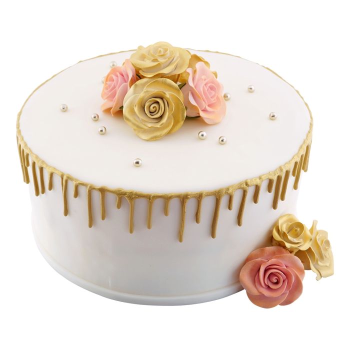 Die untersten 5 cm der Torte sind Tortenattrappe, nicht essbar. Die Rosen sind aus Zuckertragant hergestellt und sehr hart.