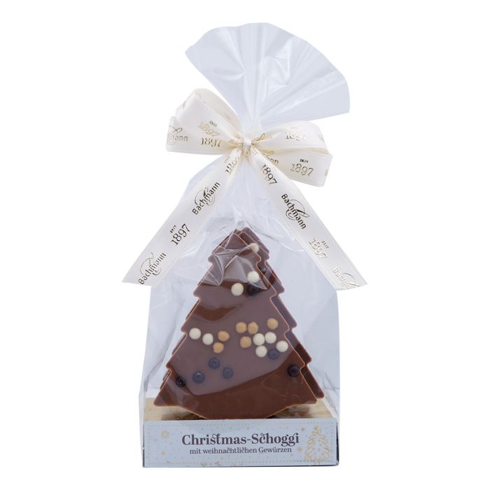 Frischschokolade Christmas Tanne - Zartschmelzende Milchschokolade mit feinen Weihnachtsgewürzen und knusprigen Crisp-Pearls. Die harmonische Verbindung von cremiger Schoggi, sanften Kakaonoten und einem Hauch winterlicher Würze sorgt für ein ausgewogenes Geschmackserlebnis. Handgefertigt und festlich veredelt – ein himmlischer Genussmoment aus der Confiserie Bachmann. Im Cellosäckli verpackt mit einer goldenen Masche mit Bachmann Logo.