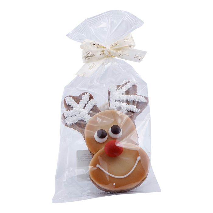 Leckerli Elch – Im Cellosäckli verpackt mit einer goldfarbigen Masche mit Bachmann Logo. Dieses charmante Weihnachtsguetzli bringt nicht nur Kinderaugen zum Leuchten, sondern sorgt auch bei Erwachsenen für genussvolle Momente. Wenn du Weihnachtsguetzli bestellen möchtest, ist der Leckerli Elch eine perfekte Wahl – liebevoll gestaltet und herrlich fein im Geschmack.