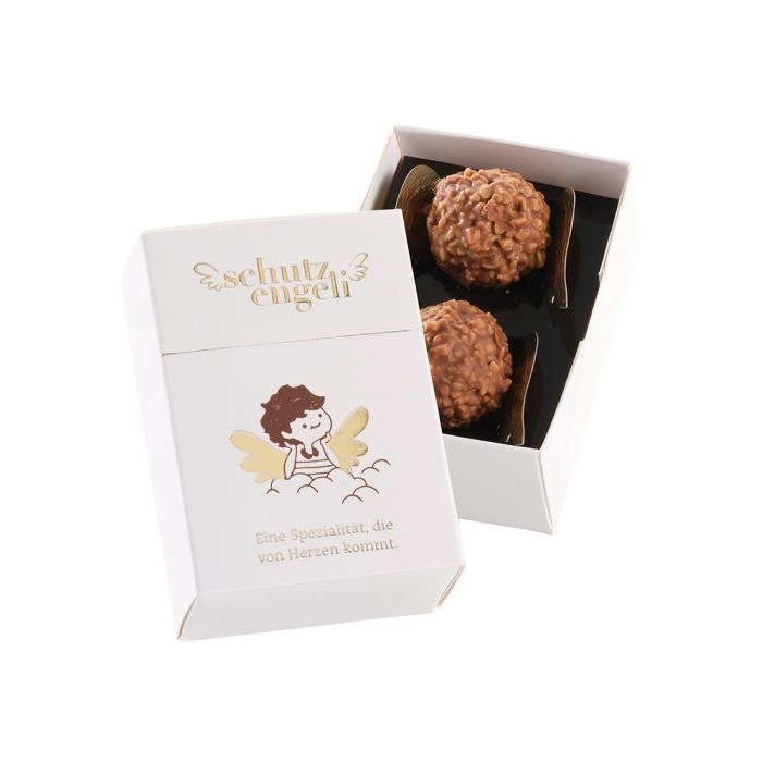 Unsere Schutzengeli sind nicht nur feine Knuspertruffes, sondern vermitteln auch ganz persönliche Botschaften: «Viel Glück!», «Bleib gesund!» oder ganz einfach «Danke». Somit ist das Schutzengeli nicht nur ein kulinarischer Genuss, sondern schenkt auch das wertvolle Gefühl, dass jemand in Gedanken bei einem ist. So brauchen wir doch alle ab und zu ein Schutzengeli. Oder zwei… oder drei.