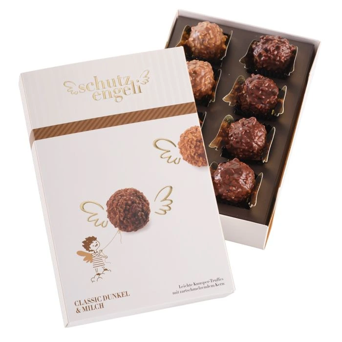 8 Stück beflügelnd leichte Knuspertruffes mit zartschmelzender Pralinécrème, umhüllt von knackigem Rochers in Milch und dunkler Schokolade.