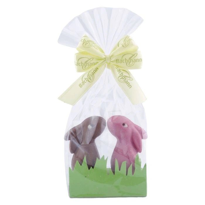 Sternschnupperli® Mini Duo - Himbeer und Milch - mit personalisierter Karte - Osterhasen aus bester weisser Schweizer Schokolade mit Himbeeraroma oder dunklen Schokoladenstückchen.Feinster Genuss trifft auf stilvolle Präsentation – Osterhase Mini Duo mit Logo steht für Qualität, Eleganz und persönlichen Touch.
