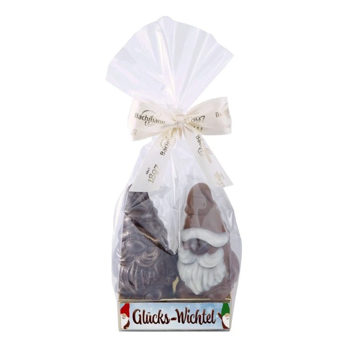 Wichtel Mini Duo mit personalisierter Karte - Ein charmantes Duo aus feinster Schweizer Milchschokolade und edler Grand Cru. Zartschmelzend, cremig und mit ausgewogenem Kakaogeschmack – ein kleiner Genussmoment, der Handwerkskunst und Weihnachtsfreude vereint. Ideal zum Verschenken oder als feine Aufmerksamkeit im Advent.